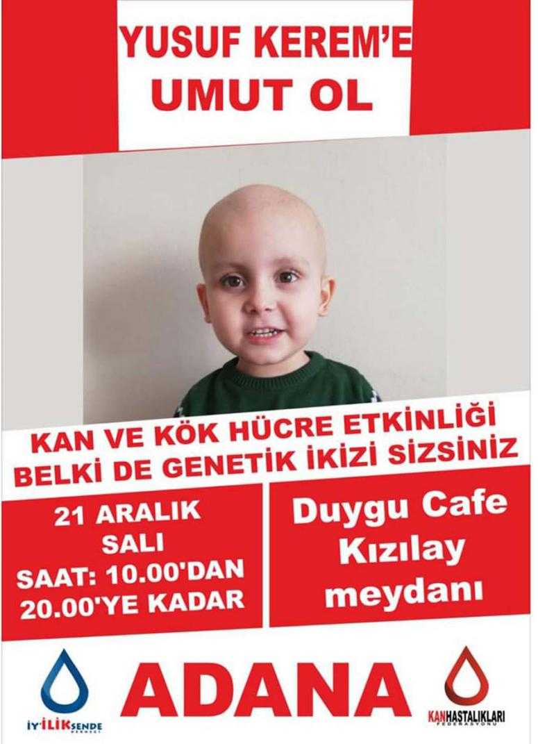 İYİLİK SENDE DERNEĞİ ile Kan Hastalıkları Federasyonu’nun 21 Aralık 2021 tarihinde Adana’da Duygu Cafe Kızılay Meydanı’nda saat 10.00’da başlayıp 20.00’ye kadar sürecek olan etkinlikle ilgili Adanalılar’a çağrı lösemili hastalarından geldi. “Ben Derin Su”, “Ben Yusuf Kerem” ve “Ben Asya Soylu” gibi çocuklar ile “Ben Polis Reşat Şevket” adlı kişiler fotoğraflarının yer aldığı el broşürler ile yaptıkları çağrıda, “Yaşama şansım belki de sensin” dediler.